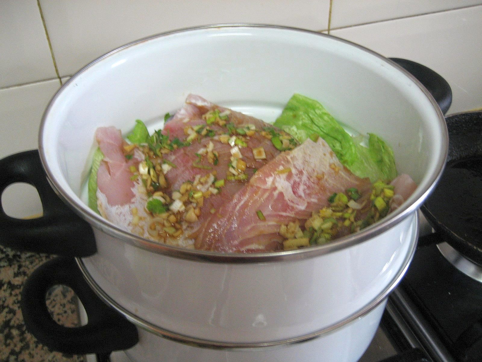 What you need to do is place a good amount of the leafy vegetables. We like to eat them so we use quite a bit. Place the fish on top carefully with the marinade. Spoon the chopped spring onions and leeks and coriander leaves over it beautifully (see pic). Steam it covered for about 20 minutes. To check if fish is done carefully poke it…if the flesh is white and flaky its done..i like my fish TOTALLY COOKED.
