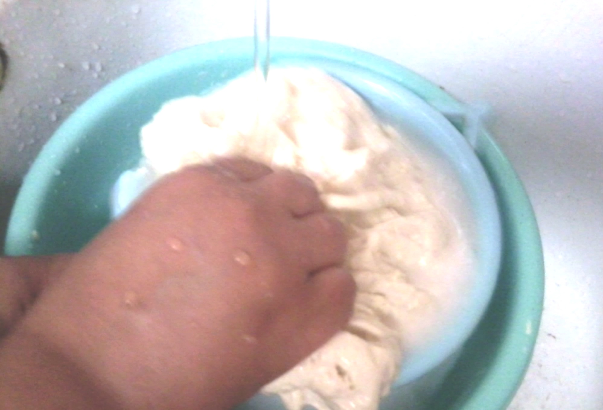 Put it in a strainer and wash it under a running tap till the water comes out CLEAR…it will take about 10 minutes for you to keep on washing and kneading it