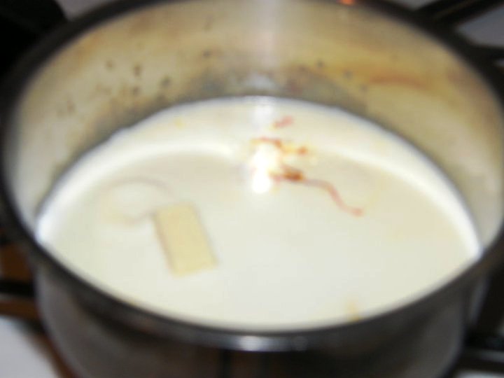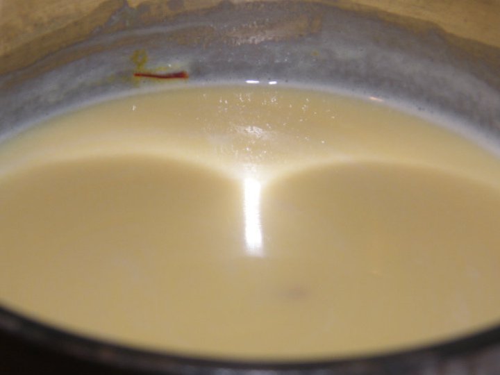 put the milk to boil with the saffron and when nearing boiling point lower the temperature and add the chopped white chocolate or the condensed milk.