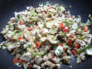 in a hot wok, add the chicken mince (without oil) and sautee on high heat , breaking up the chicken into small small bits as you sautee it. When its not raw add all the vegetables except the bean sprouts. Add salt and a bit of soya sauce and sesame oil. Mix for a few seconds remove off the heat and add the bean sprouts and cool the mixture thorougly.Check and correct seasoning