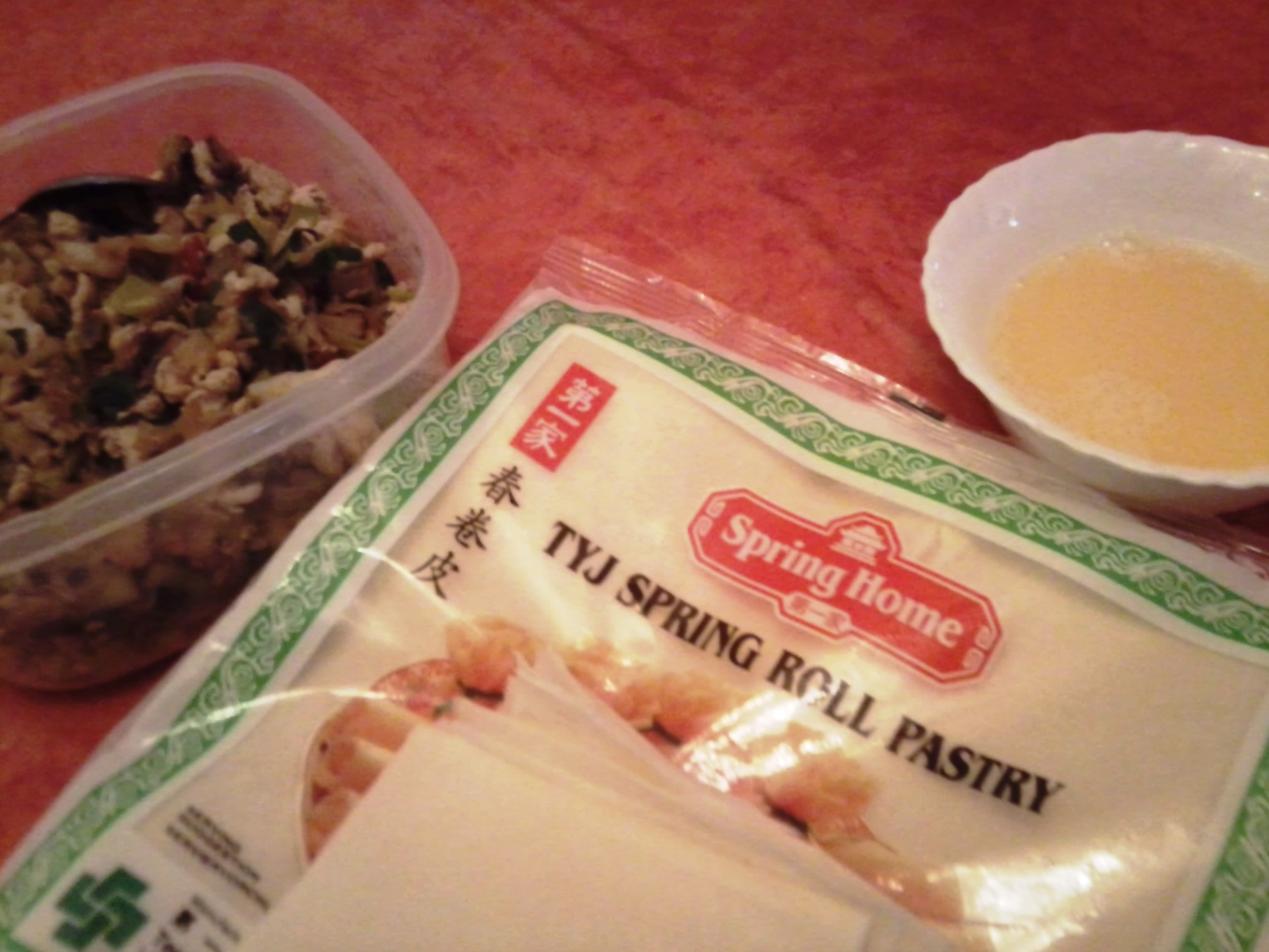 STEP 2…The ingredients all ready..the filling, the spring roll wrappers and the beaten egg