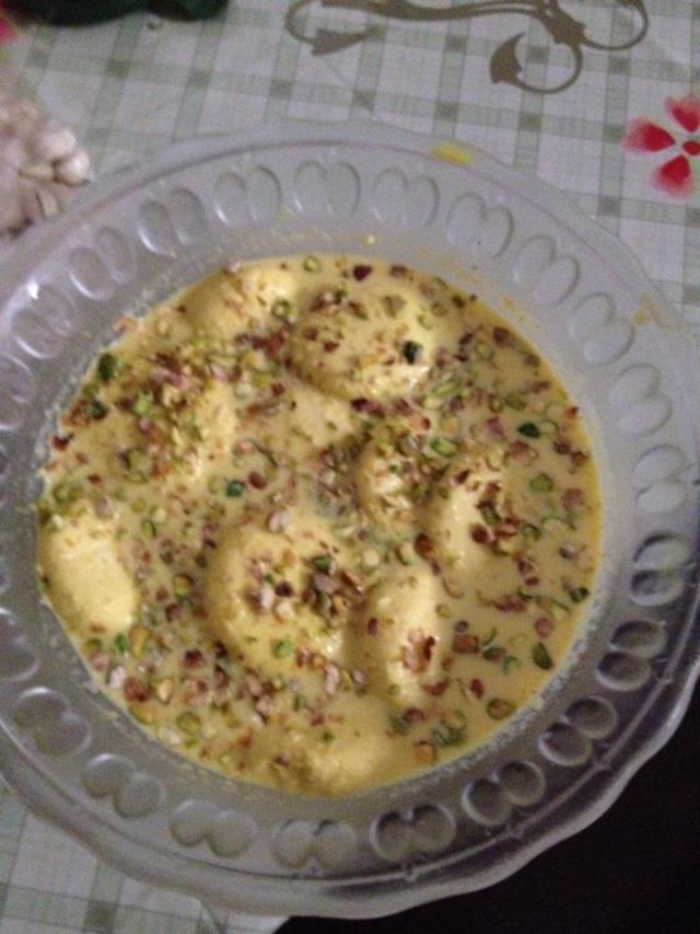 after 10 mins take them out and put them into the boiling milk. add cardamom powder, and further boil for another 10 mins. cool and add rose water. decorate with nuts of ur choice…the pic has pistas 🙂