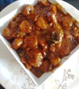 Heat oil in a wok , saute the marinated soya chunks for 2-3 min and remove.Now in the same kadai add little more oil and saute onion, garlic and ginger for 2-3 min. Now add soya chunks and water and close the lid. cook for 5-8 minutes).add tomato ketchup, and other sauces and again mix. add vineager and mix well. now add capsicum and the remaining 2 tbspn of corn flour mixed with little water and cook till the gravy thickens.