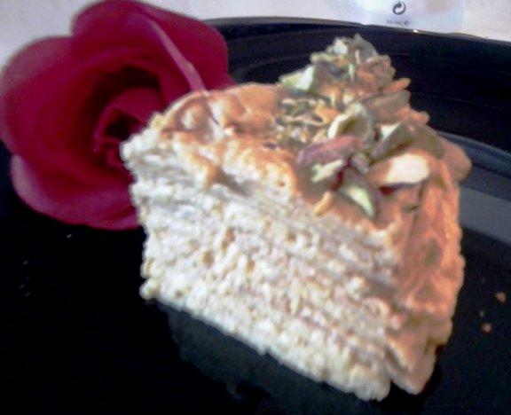in a plate put one crepe and then spoon the cooled custard on top of it and cover with another crepe, repeat till all the crepes and custard is used up. decorate with nuts of your choice and refrigerate overnight for the flavors to blend.