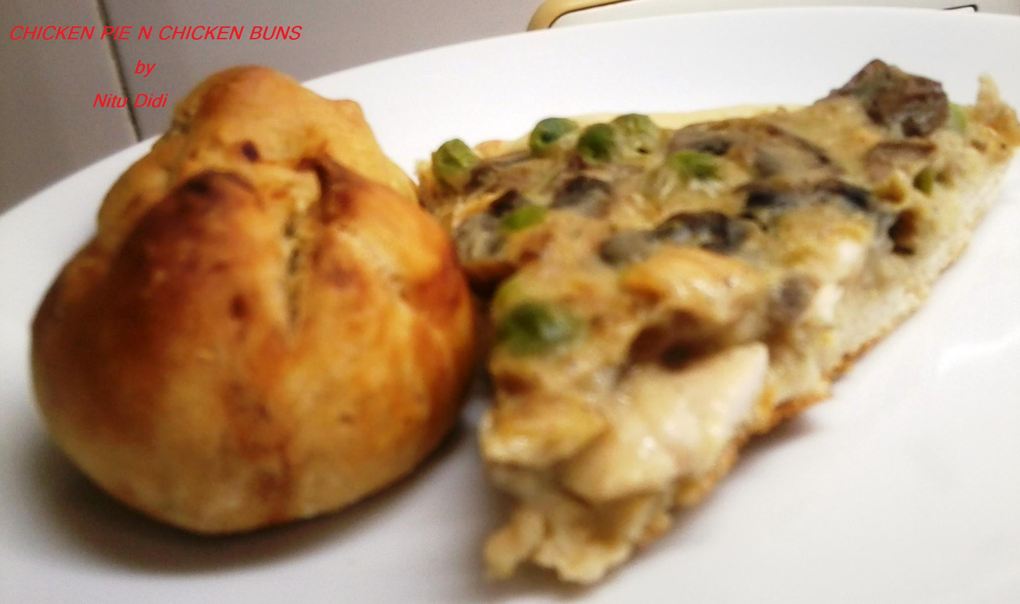 in a skillet melt the butter or heat the oil and sautee the chopped onions till transparent. Add the flour and stir for about a minute taking care it does not burn. Then add the milk and cook till thickened. Add the mushrooms, peas and the chicken and season with salt pepper and oregano. Cook till thickened. Cool the mixture thoroughly and then spread it on the dough if you want to make a pie or fill it into the dough to make buns.