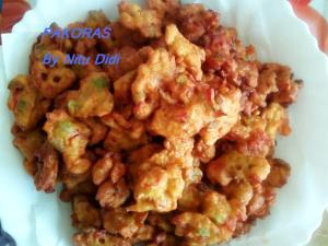 heat the oil in the deep fryer. Prepare all the vegetables and mix with the gram flour, add the seasoning and mix everything verry well. Add the carbonated water and make a thick batter. Drop spoonfulls into the hot oil and fry till golden brown. IMPORTANT…do not let the batter sit… else the carbonated water will lose its fizz and then the effect of using it is lost