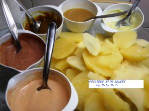 Cut the potatoes into thick rounds and boil them in a lot of salted water till just about done. Cool them and place on a plate, Serve with all these sauces which are in tiny containers.