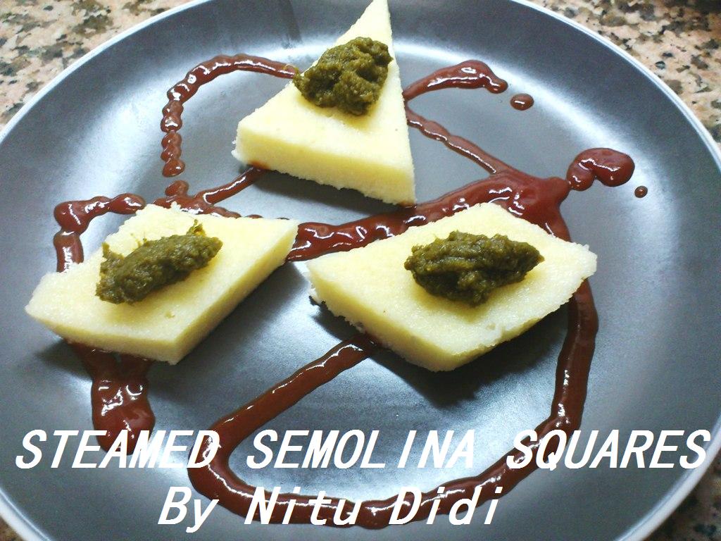 I had once decided to make semolina idlis(indian steamed rice cakes) but i did not have the moulds….so i thought of making them as i make dhoklas (another variation of steamed semolina squares) so i followed my normal recipe by making the batter and i got busy at home and forgot all about it for a few hours. I then realised i had this batter sitting on my kitchen shelf and i put it to steam without any rising agent!!!! It took faster to steam and i was wondering why and it was only when i cut it did i realise i forgot to add any rising agent!! It tasted verry nice and it did not crumble while cutting coz the cake was much firmer….I am now sharing the recipe with all of you !!!
