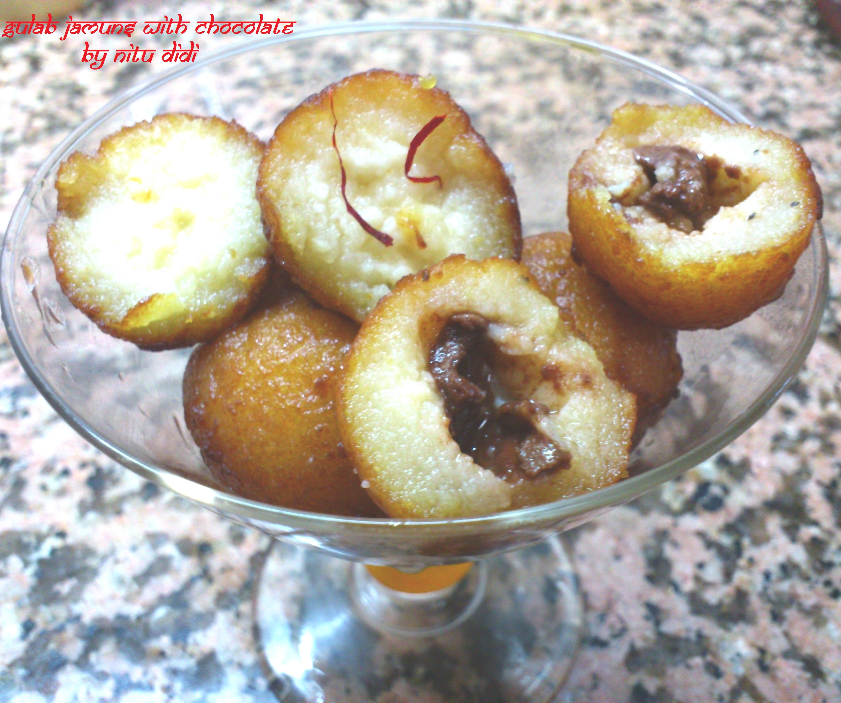 This is my creation of something nice and richer than the ordinary gulab jamun!! For very special ocasions or if your in the mood for something “different” and yet traditional… I just made up the gulab jamun dough and cut bits of white and milk chocolate into tiny bits and stuffed them into the jamuns. Flatten the dough and then add a tiny piece of chocolate of your choice..Not too much or else it will leak out while frying. When shaping the dough into a ball seal very well and take care to apply a bit of pressure so it seals well. Nitu Didi TIP: i used slightly wet palms to do this as the dough kept on drying up and too soft a dough makes the gulab jamuns soggy. Deep fry as the recipe says and put into the syrup!! WITH THIS I TAKE THE OPORTUNITY TO WISH ALL OF YOU WHO LOVE AND FOLLOW ME A VERRY HAPPY DIWALI. MAY YOU ALL BE BLESSED