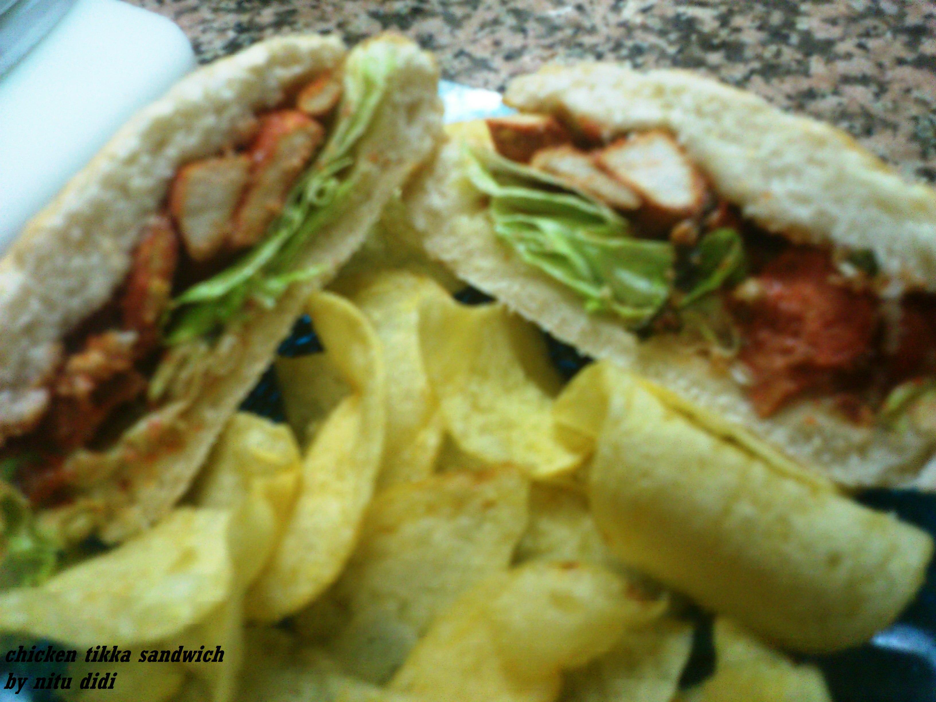 Good way to finish or serve “chicken tikka” differently. Excellent for picnics or tv dinners. What you need is left over chicken tikka, lettuce leaves, gherkins and/or pickled onions all sliced fine. Take bread of your choice and apply mayonnaise or sauce of your choice..I use a blend of mayonnaise with chutney and ketchp!!! Tastes amazing!! Then add the lettuce leaves, gherkins and chicken tikka pieces chopped up and top with the other slice of bread and serve!!