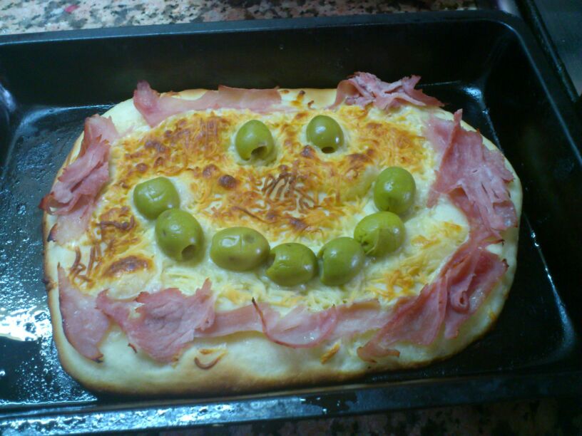 shape the dough into a nice oblong or round shape about 1 inch thickness. Put olives into it pressing them in slightly. Bake till browned