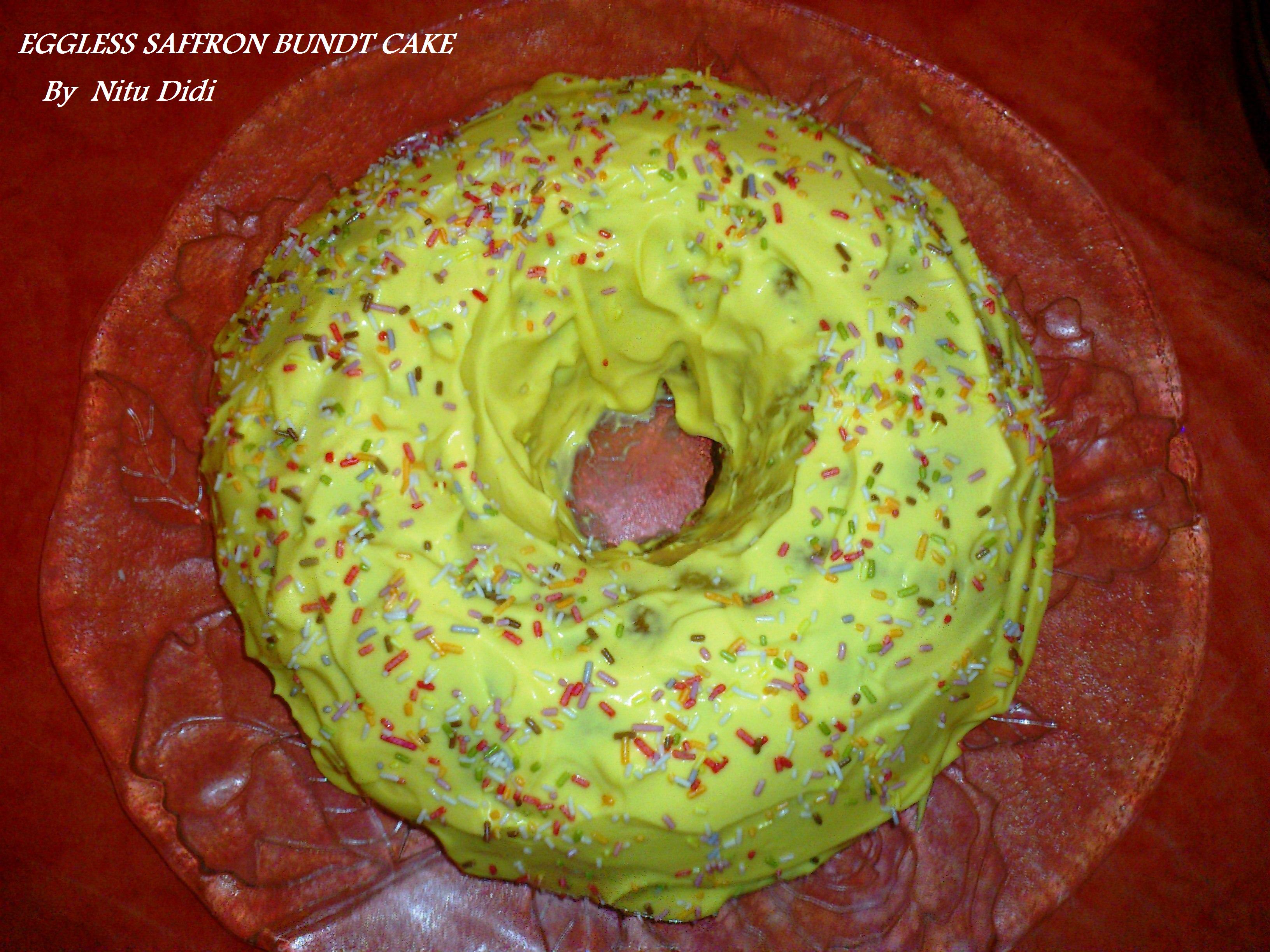 heat the oven to 200 degrees while you make the cake batter. Beat the yogurt with the sugar and add the soda bicarb and the baking powder and allow it to rest for about 3 minutes till its nice n frothy. Add in the Nitu Didi pure spanish saffron and the cardamom powder and vanilla and add the oil and mix well. Add the white flour slowly and lastly fold in the boiling milk. Lower the oven to 180 degrees and pour the batter into a pregreased and floured bundt tin or any baking pan of your choice and bake till done.