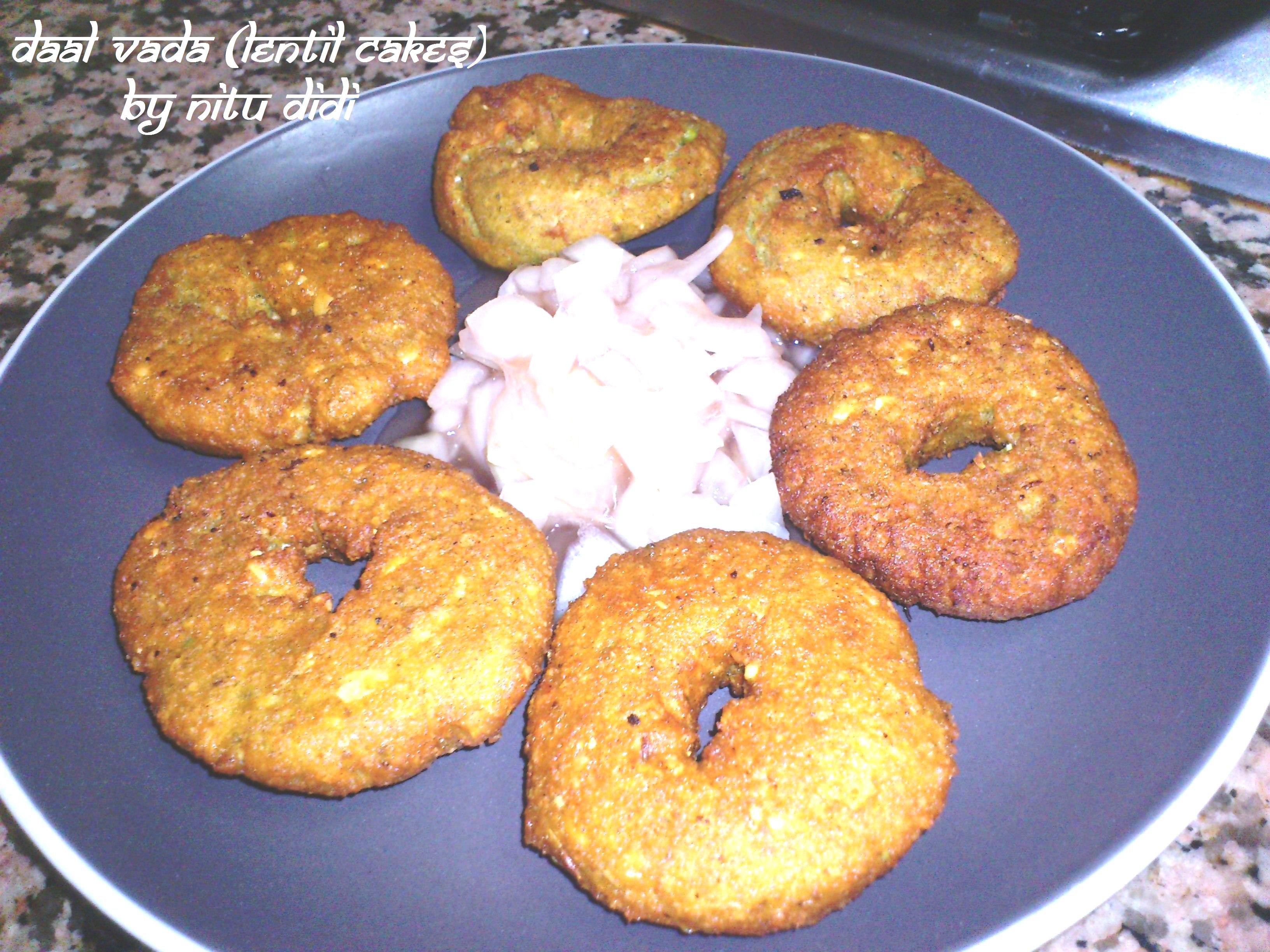 Heat the oil in a deep fryer and now to shape the vadas: wet your palms a bit with water and take a bit of the lentil paste and shape it into a ball and then flatten it carefully. Make a hole with your finger and slide carefully into the oil without burning yourself. If you find this difficult just use the spoon to scoop spoonfuls of the batter and put into the oil and deep fry till golden brown and crispy. Serve with chutney of your choice. I served them with sweet and sour onions. Chop onions and add salt and sweet and sour sauce to them and let them rest for about 2 hours in the fridge so the flavours blend.