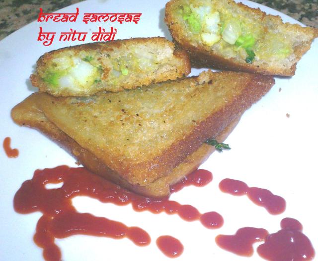 Mix the potatoes with the peas and all the spices , green chillies , coriander leaves, lemon juice and keep aside. Take a slice of bread and wet your palms. Put a bit of the potatopeas mixture on one corner of the bread and fold it to shape into a triangle. Press the edges together with your palms. Since they are wet they will help you to bind the triangle together. Press well so that when you deep fry it the edges wont open out.ย Use up all the filling in the same way and then heat the oil and deep fry the triangles till golden brown. Drain on absorbent paper and then serve with sauce of your choice
