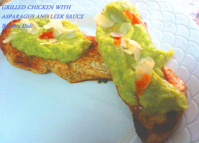 boil the asparagus and leeks in enough milk to just cover it till soft. If using cream boil it in water and then add the cream later while blending it. When the asparagus and leeks have softened let it cool and blend it in the blender till smooth. Season with salt and pepper. Heat when needed and pour over grilled fish, meat or chicken, Serve with flaked almonds and dots of tabasco sauce.