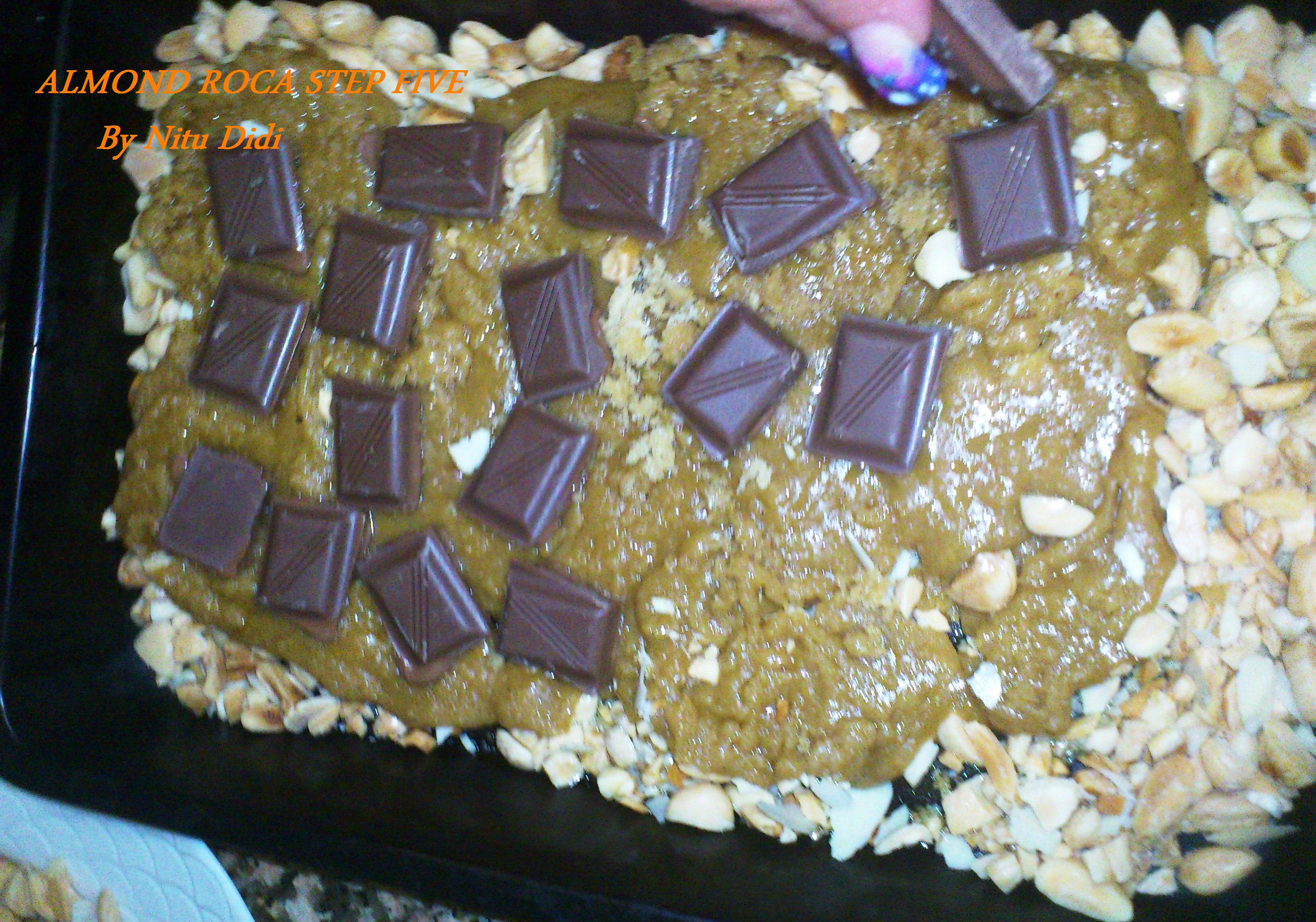 Pour the hot caramel ontop of the crushed almonds and immediately put the chocolate pieces on it…the pieces will melt with the heat