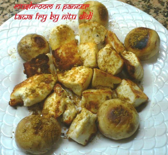 heat a grill or a pan till quite hot and then add the olive oil and the paneer cubes and mushrooms and grill till browned. Sprinkle with the prepared or the bought spice.