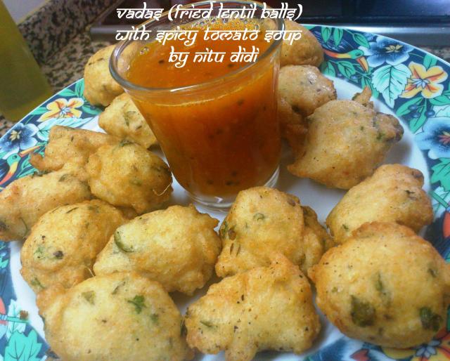 Vadas are basically fried balls made with lentils. This delicacy hails from the south of India. Its usually eaten for breakfast or snacktime but in my home we eat it for lunch. Its usually served with “sambhar” which is watery spicy lentil soup with vegetables and coconut chutney. I personally feel its a bit too much of lentil here so i serve it with this spicy tomato soup. This recipe calls for urad daal(white lentils) but if you cant get that and want to try this dish out then just use any lentils you can lay your hands on!! Its a good gluten free recipe for those who are allergic to gluten and its also a vegan recipe.