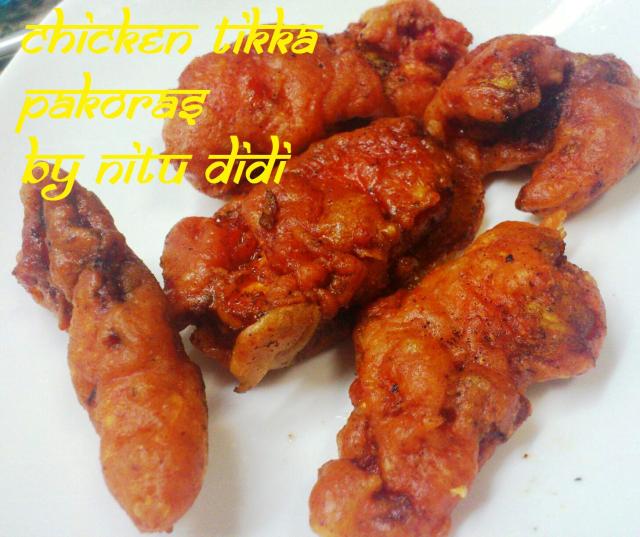 This has to be one of the most versatile recipes of mine! I never imagined one can do so much with simple”chicken tikka”!! Its best if you marinate a big batch and you can grill it, make chicken tikka masala and now even these awesome pakoras! Do keep in mind that when you marinate chicken tikka you can keep it in the refrigerator marinated for about a few days. These pakoras can also be frozen or made in advance for a party. I used “Nitu Didi” tandoori spice powder and added a bit of red food coloring to it but you can use any tandoori spice powder as you like.