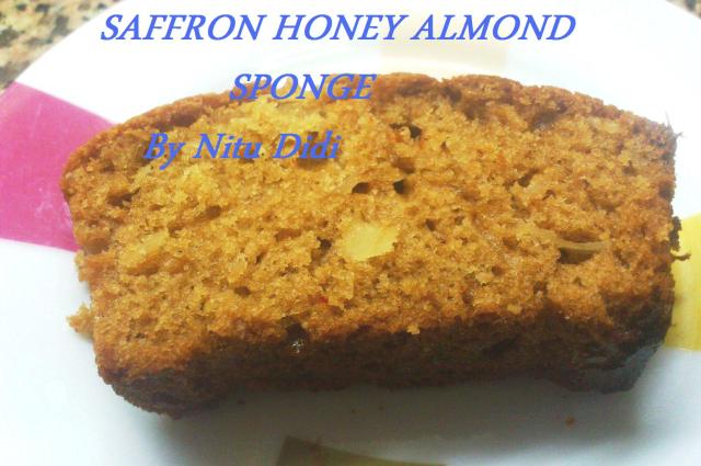 Mix the yogurt with the sugar, the saffron and the baking powder and baking soda and leave it for a few minutes to get all bubbly. Preheat the oven to 180 degrees. Sieve the white flour and add to the fluffy yogurt and mix well. Add the oil and the egg which is totally OPTIONAL. Add the honey, the almonds , and the cardamom powder , and rose essence. Mix all well. Add the hot milk in the end. Put into a sponge tin and lower the oven to 175 degrees. Bake till done, it should take around 30-40 minutes. Check by inserting a toothpick …if it comes out clean your sponge cake is done to perfection 🙂 Cool and cut and eat…. Its delicious over a cup of tea!!!