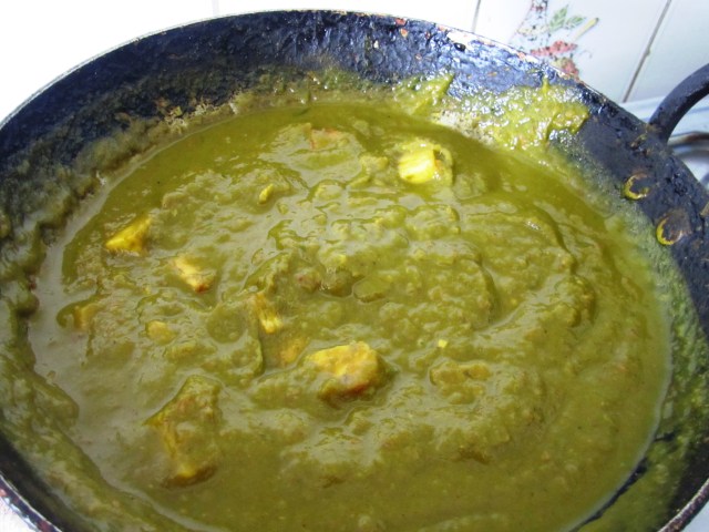 Boil it till the spinach and the tomatoes, onions and all are cooked. I did not add any water to it while boiling. When a bit cooled puree the whole mixture. Heat the mixture in a pan till well heated and then add the fat free cream cheese. Mix till the cheese blends with the spinach puree. Add the paneer cubes and mix well till all is heated through.
