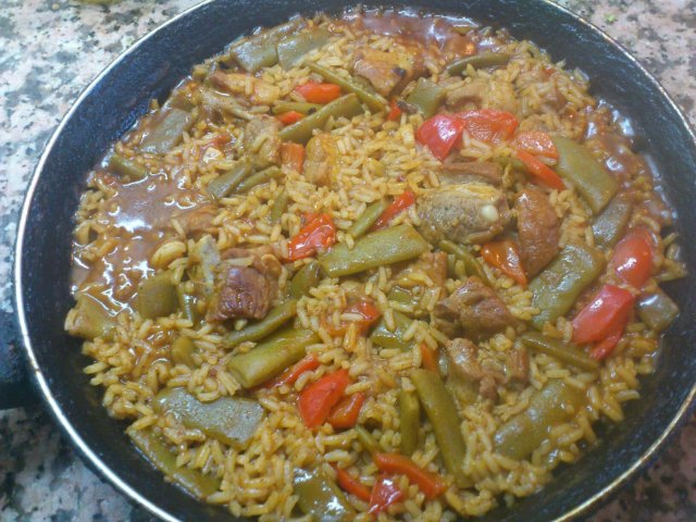 In a pan heat the olive oil and add the ribs and the bay leaf and fry till the meat turns brown. Add a little salt and then the minced garlic and cook til garlic changes color. Add the beans and the capsicum and sautee . Add the paella spice mix and the tomatoes. Cook till tomatoes are cooked. Add the rice and sautee the rice a bit. Add the water and cook till the rice is done and all the water is absorbed. Serve hot with a nice glass of beer or wine!
