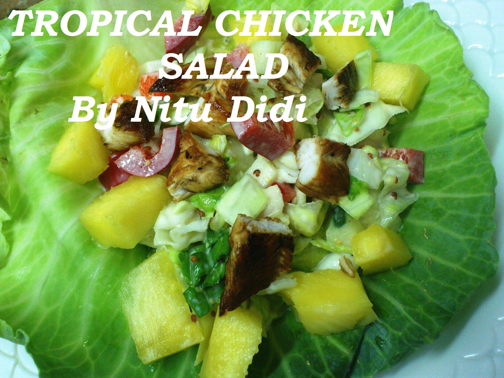 mix all the ingredients for the salad in a big bowl. Mix the ingrediens for the dressing together. Add the dressing into the salad and toss well. Serve it on a cabbage leaf or in individual glass bowls. What i did was decorate it with some chicken strips and cubed pineapple.