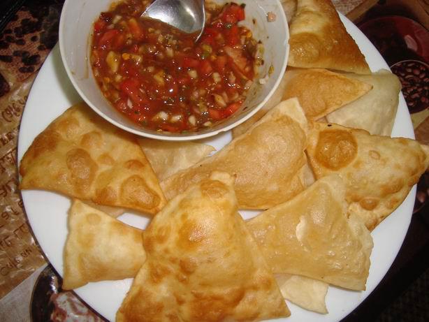 For Flour crackers, Just mix white flour with a little bit of oil and salt and keep kneding it until nice and hard, roll it to look like a shape of a round torilla bread. And cut it into 8 slices or 6 slices to make it look like a triangular pizza slice….and deep fry it until it’s crispy. These flour crackers can be stored in a container.