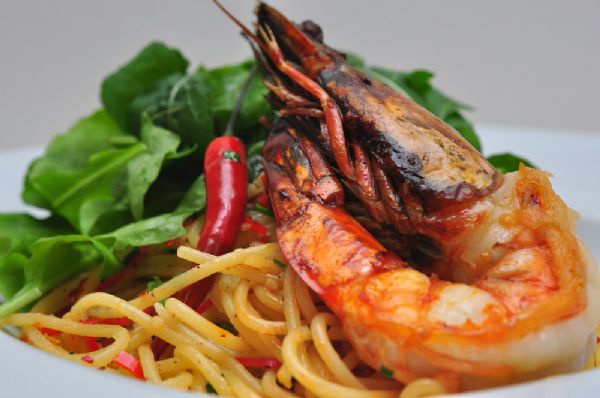 9. Portion the pasta into a pasta plate and lay a king prawn on top.