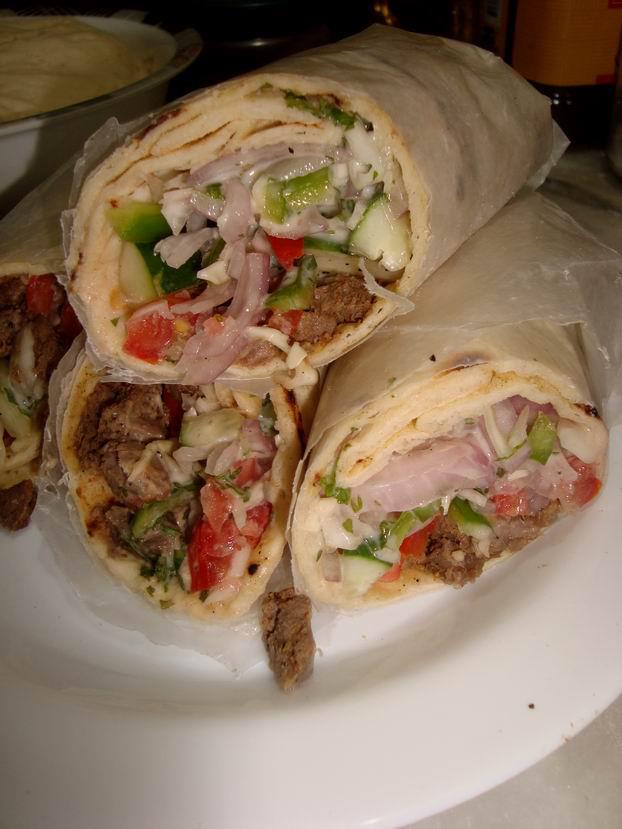 Make the pita bread and slit it open when cooled. Spread with garlic yogurt sauce, add the sliced meat (or falfels) and then top with the chopped veggies. Roll into a roll OR just roll as you wish and eat….