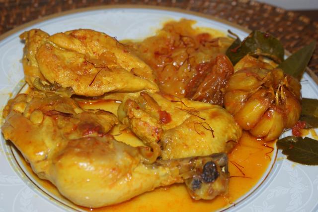 Heat the olive oil in a pan and add the chicken pieces and seal the chicken pieces on high heat. Add salt and let them brown on both sides. Once they are browned remove and keep warm. In the same oil add the sliced onions and sautee till transparent. Add the bay leaves and add the chicken pieces. Cover and let the chicken pieces take in the aroma of the bay leaves for about 30 seconds. Add the paprika, the saffron and the chopped tomatoes. Cook till the tomatoes are all mushy. Add the whole garlic head and add the wine and the brandy and cook uncovered till it all evaporates. My halaal followers can use chicken stock or water. Once the wine and brandy have evaporated check if the chicken is tender. How do you check it? Prick it with a knife and if the juices run clear means the chicken is done. If its not done add some stock/water and cook till its done. Serve hot with french baguette.