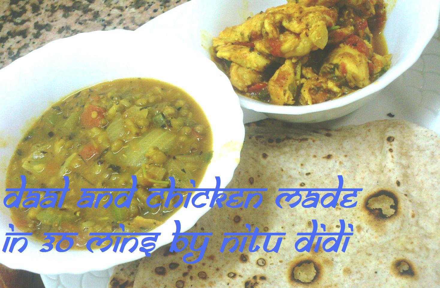 I actually made this meal in about 30 minutes. It is a meal for one person. A real typical indian meal of lentils and chicken with some rotis. The roti dough i already had in the fridge! But the lentils and chicken was cooked in a little over 30 minutes. You can make many meals in 30 minutes with a little pre-prepared ingredients from the fridge.