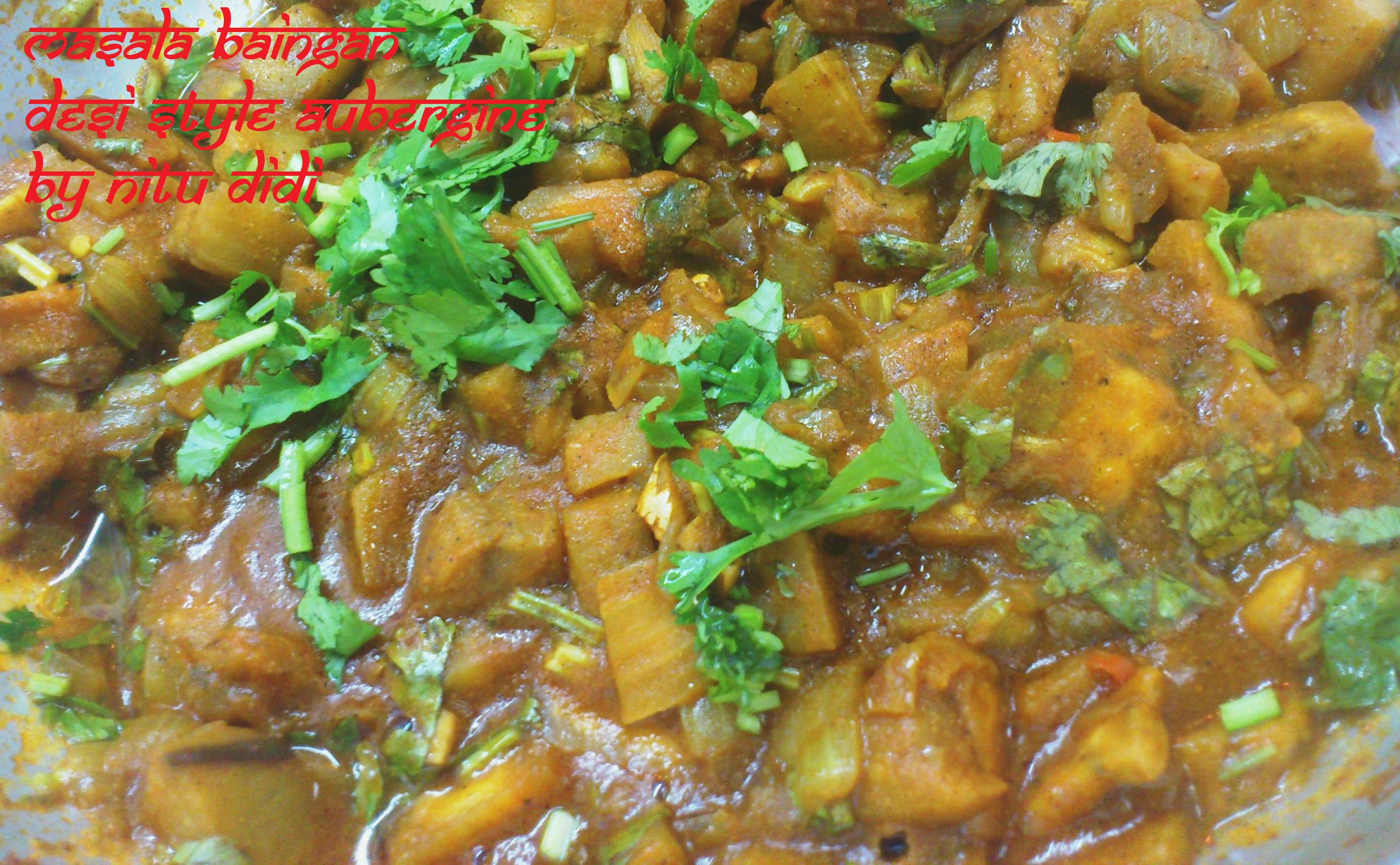 Ok… i will write the way my aunt used to make it and then the way i have adapted the recipe to try and recreate her style because of the quality of onions available here in Spain. What my aunt would do is take a heavy bottomed pot and add the oil and then a layer of onions, aubergine, tomatoes, sprinkle salt and the spices. Add the ginger , green chillies and coriander leaves and cover the pot with a tight lid and cook it on low heat till the aubergines and onions were soft. It would take around 15-20 minutes. She would then open the lid, give it a good stir and cook till the water had evaporated and serve.