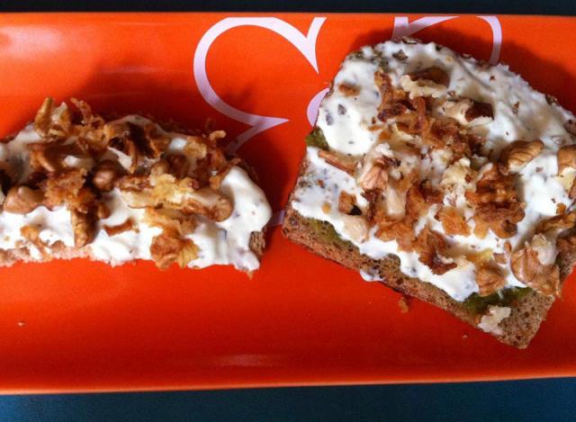 Spread the bread with the chutney, top with sauce of your choice and sprinkle with nuts and fried onions (we used the ready made fried onions as they are really crispy)