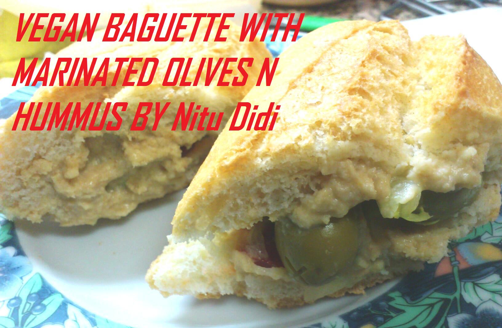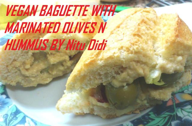 A lovely on the spur lunch when you have no time or even a different way to use up left over hummus. This vegan baguette is delciously healthy and tasty too. I bought some marinated olives from the supermarket but you can use any type of seedless olive. INGREDIENTS FOR 1