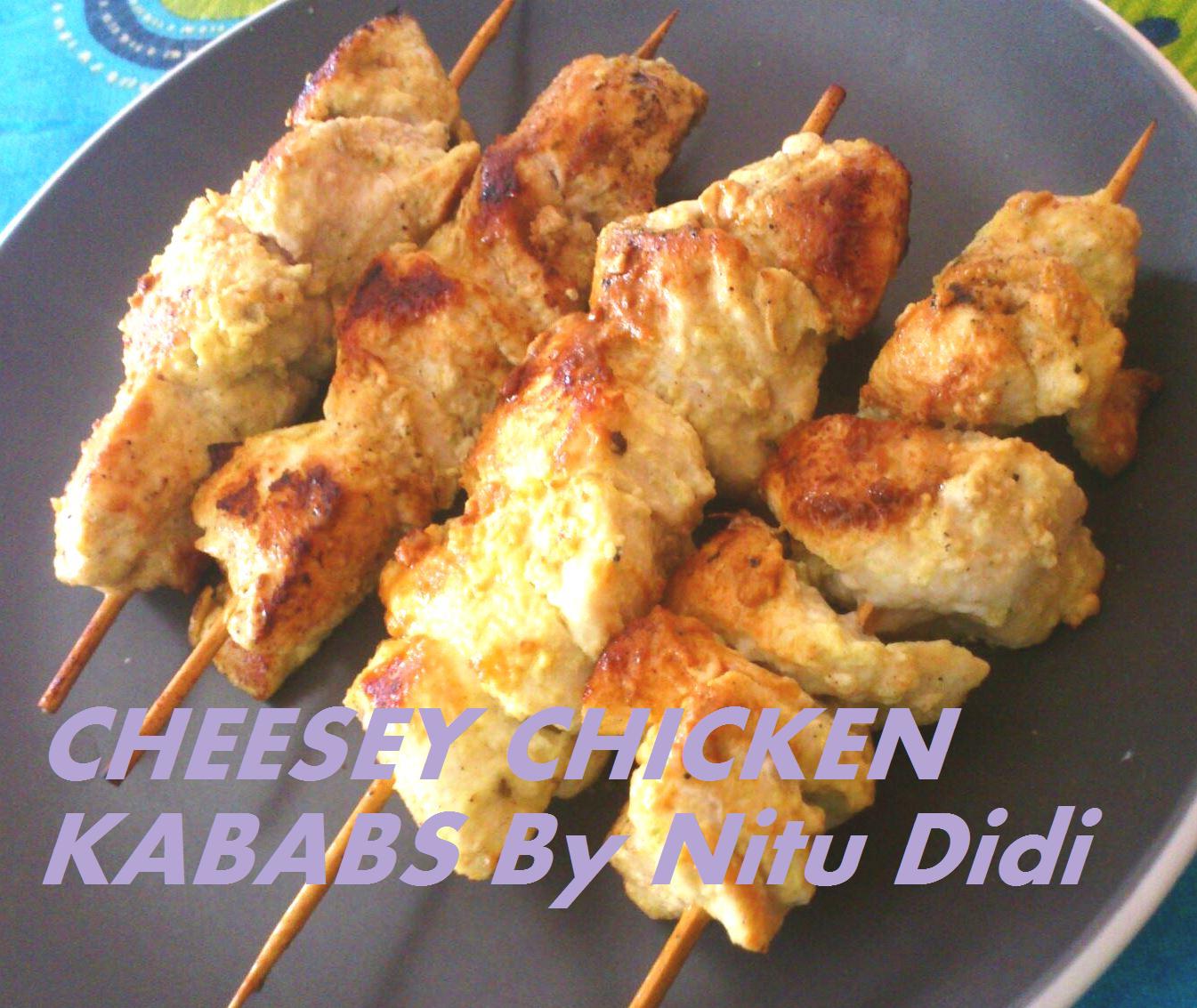 These kababs are melt in the mouth, delicious and very easy to make. I have not used any ground dry spices in this recipe except for turmeric for a little color. The chicken tastes so succulent and tender and just the marinade is enough for taste. I put them in wooden skewers but you can even serve them on toothpicks or just cubed. I grilled them on a non stick grill but they cant be also barbecued. I dont think cooking them in the oven is a good idea as chicken breast tends to turn dry. You can use the marinade to make cheesey paneer, cheesey tofu, fish, or meat of your choice.