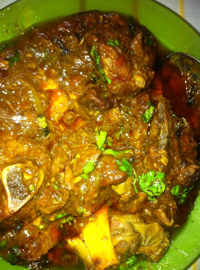 In a pan or pressure cooker ( i used a pressure cooker because when i put the meat to cook in the pressure cooker the gravy becomes nice and smooth).Put the pan on heat and add the oil and then the bay leaves, the cloves  and the cinnamon and after a few seconds add  half the ginger and garlic. Let the ginger garlic cook a bit (do not burn) and then add the washed mutton and let it cook. First you will see all the juices coming out of the meat…then it will start to brown..this takes time..be  patient… have a glass of wine or beer while doing this…or log onto facebook!!! Once the juices evaporate the meat will start to brown. As soon as the juices evaporate and the meat starts browning slightly add the chopped onions and the salt and the rest of the ginger garlic. Let the onions soften and then they will turn mushy and start to brown. You are doing this perfectly. When they are browned add the turmeric powder, the coriander powder , garam masala and red chilli powder if you want it hot. Give it a good stir and then add the tomatoes. Cook till they are mushy and once they are mushy add the green chillies. Once this is all done you will see your lamb getting quite soft. If using any other meat like mutton or beef you may need more cooking time. Add the water and put the cover on the pressure cooker and cook for maximum two whistles. If cooking in a normal pan add the water and cook till the meat is tender. Once the pressure cooker is cooled down open the lid carefully and taste seasoning. Add the cardamom powder and the chopped coriander leaves.