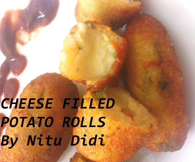 Take a bit of potato dough in your greased palm and flatten it. Add a small piece of cheese and then bring together the edges of the potato mash mixture and shape into a roll using a little pressure. See that there are no cracks in the roll. If you find a crack try and cover it with some more potato mash. If there is a crack the cheese will ooze out while frying and your oil will get messy.