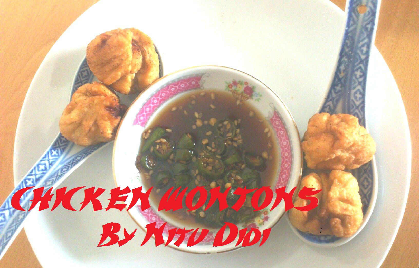Take the wonton wrappers and put a small amount of minced chicken in it and bring up the edges. Use a mixture of white flour and water paste to seal it. Keep it them in a greased plate (grease the plate with oil) and cover, Make up all the wontons in the same way and then deep fry them in medium oil till golden brown. If you fry them in very hot oil they will brown quickly and the chicken will not mince.