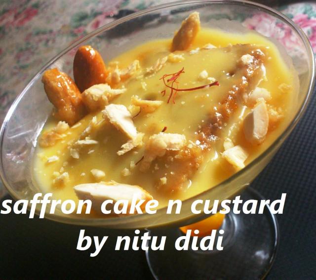 I just love custard! And i just love Birds Eye Custard Powder! I have tried so many other brands but…nothing absolutely nothing comes up to its mark in the remotest of comparison. I know custard is made with egg yolks and milk…but what about the vegetarians? Off late i have been trying to make eggless desserts. What i like about this custard is the flavor..the original one has such a suble flavor that you can flavor it the way you want 🙂 I made up this delicious, rich dessert from some left over saffron cake which was drying out. Yes in my home sometimes they do get fed up of cake!! When that happens one can make cake pops or a pudding out of it.
