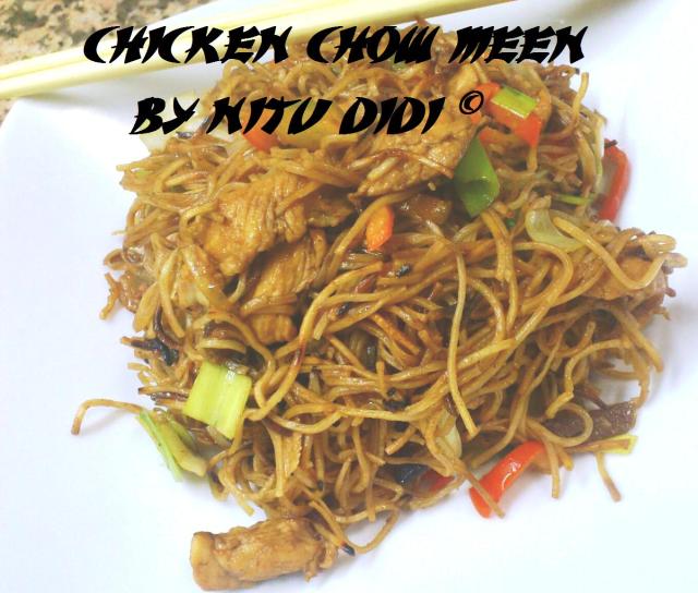 Heat 2 tablespoons of oil in a wide wok and put a batch of the cooked noodles in and let them cook on one side till browned and crispy and then turn and let them cook on the other side. Brown all the noodles batch by batch using some more oil untill you have all the noodles browned. Keep them aside. In the same wok add some oil and sautee the chicken on high heat till it turns brown, Drain off and keep aside and let the juices remain in the wok. Add the mushrooms, capsicum , leeks and season with a bit of salt. Stir for a few seconds and then add the noodles and the soya sauce and mix well. Keep on tossing on high heat and then add the cornstarch dissolved in the water and cook till the cornstarch thickens. Check seasoning, add more soya sauce if needed. You can also add some chilli sauce if you like it hot. Sprinkle with sesame oil in the end and serve hot.