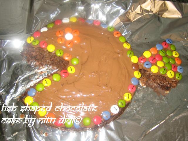 This is a simple video on how to decorate a chocolate cake in a fish shape. All you need to do is bake a chocolate cake. You can use any of the recipes from my blog. Then you need some melted chocolate (put some chocolate bars to melt in a double boiler) and then you need some smarties.