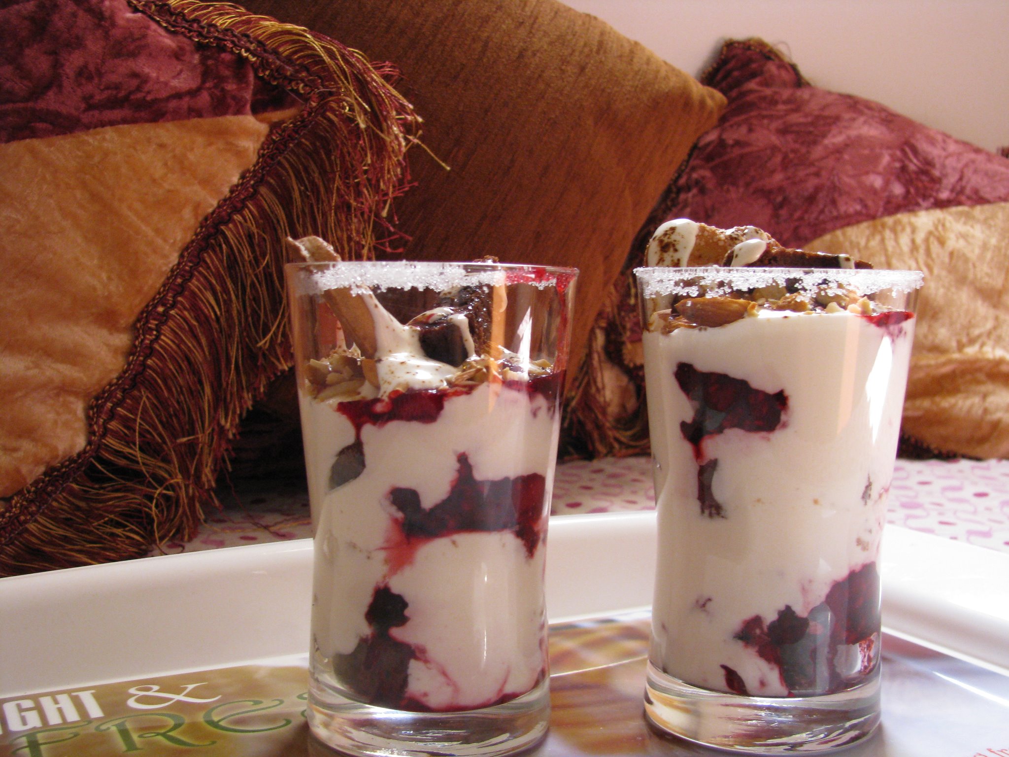 (healthy dessert made with berries, dry fruits, and yogurt)