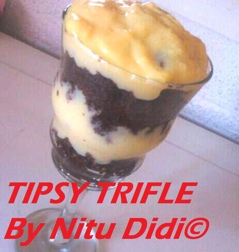 I put a layer of cake in a glass (you can also use a dish) and then i poured some liquer on it, (this time i felt like using something different so i used gran mariner) and then poured a layer of thick custard and then again cake with a few drops of liquer and then again some custard. This was left to set in the fridge till it sets and the cake soaks up the liquer.