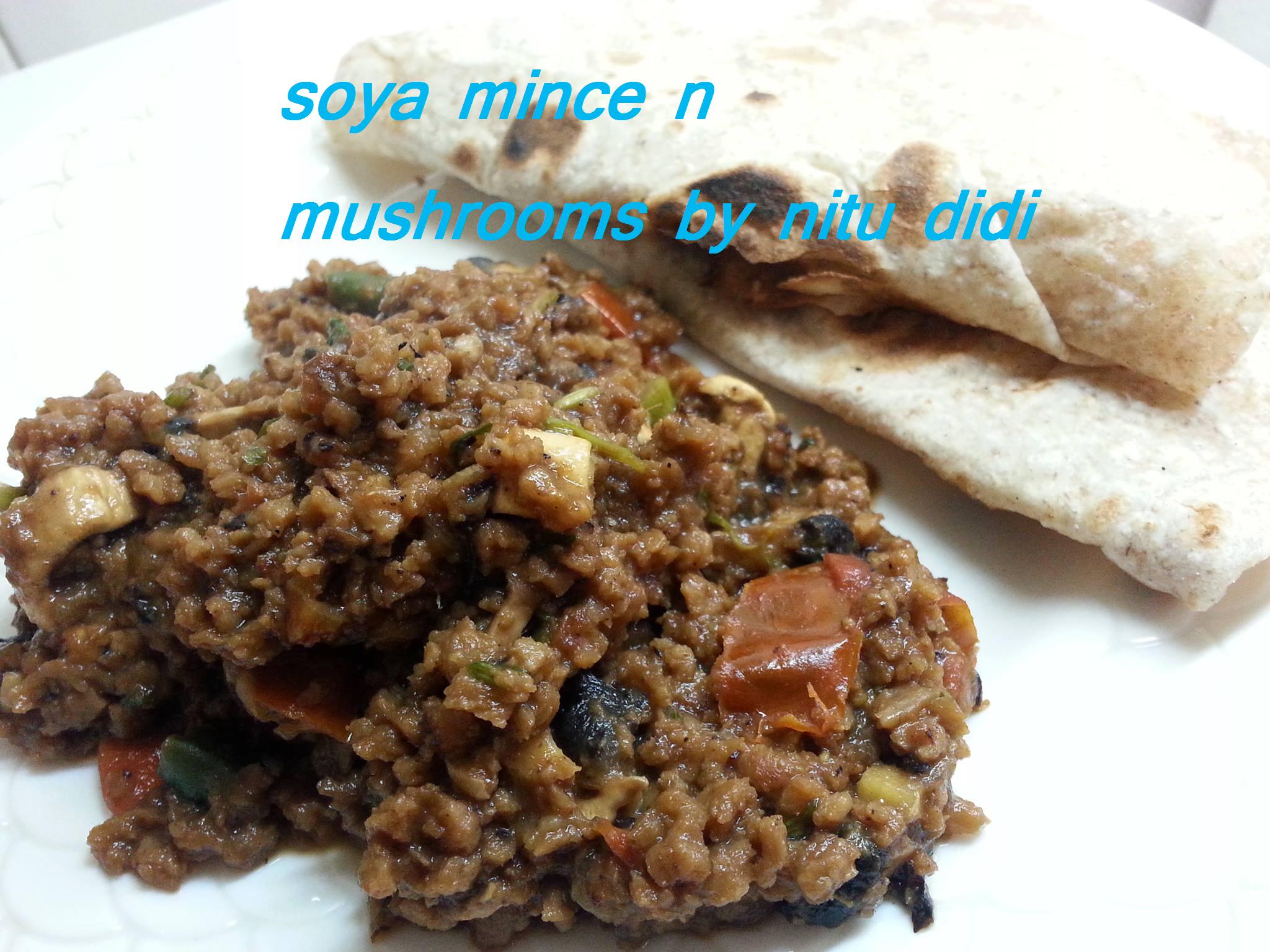 Brown the onions in oil till really well browned and then add the ginger garlic paste and cook for a few minutes more. When nice and brown add the soaked soya mince with the water and cook it with the browned onions for about 10 minutes stirring on and off till the soya mince has changed color and is browned. Add the garam masala and the mushrooms and tomatoes and cook till the tomatoes soften. Add the green chillies, salt and the coriander leaves and give it a good stir. If you want it with a little gravy add some water and bring it to a boil. If you want it dry then its ready to be eaten. You can also add some ground black pepper and some lemon juice to this.