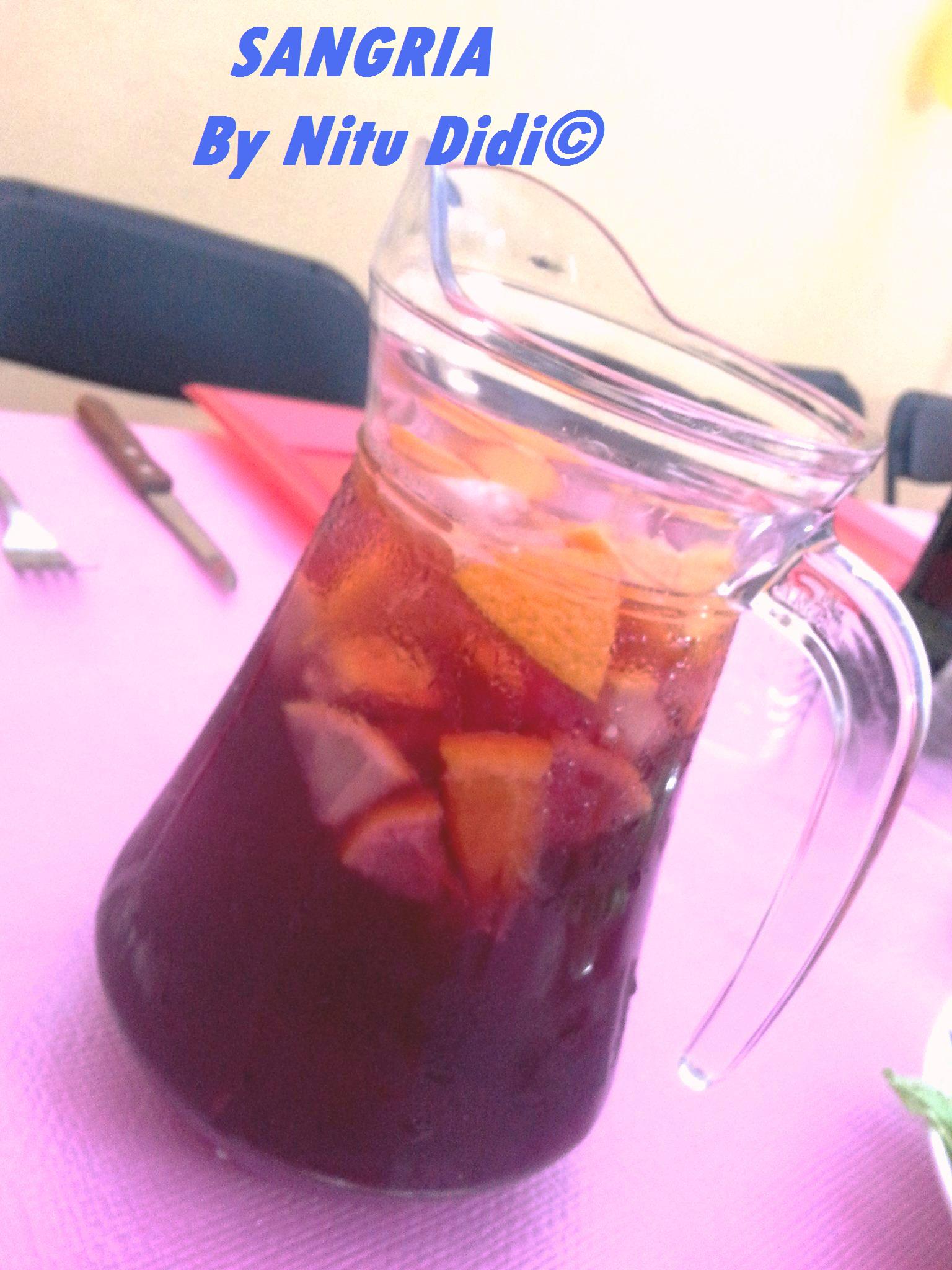 Think Spain and apart from the bullfights and beaches and ofcourse the tapas, Sangria immediately comes into your mind. Jugs and jugs of it is served all over Spain in its quaint side cafes, restaurants, and pubs. A good sangria is just the blend of a few “right” ingredients. Everyone has their own taste, some like it sweeter while some like it more potent. I was recently in India and taught how to make spanish paella and sangria in my cooking workshop. I was also requested to make a non alcoholic version which I did. I was told it was the most amazing sangria which they had tasted. This recipe of mine is an result of watching many bar tenders make sangria and also a bit of my own preference. I do like it both sweet and potent but without being too sickly. In Spain they serve it in jugs, topped with chopped fruit and in the bottom of the jug you can see a layer of sugar which you need to stir before pouring the sangria into the glasses. I prefer my sangria without the sugar, so THAT is something totally optional.