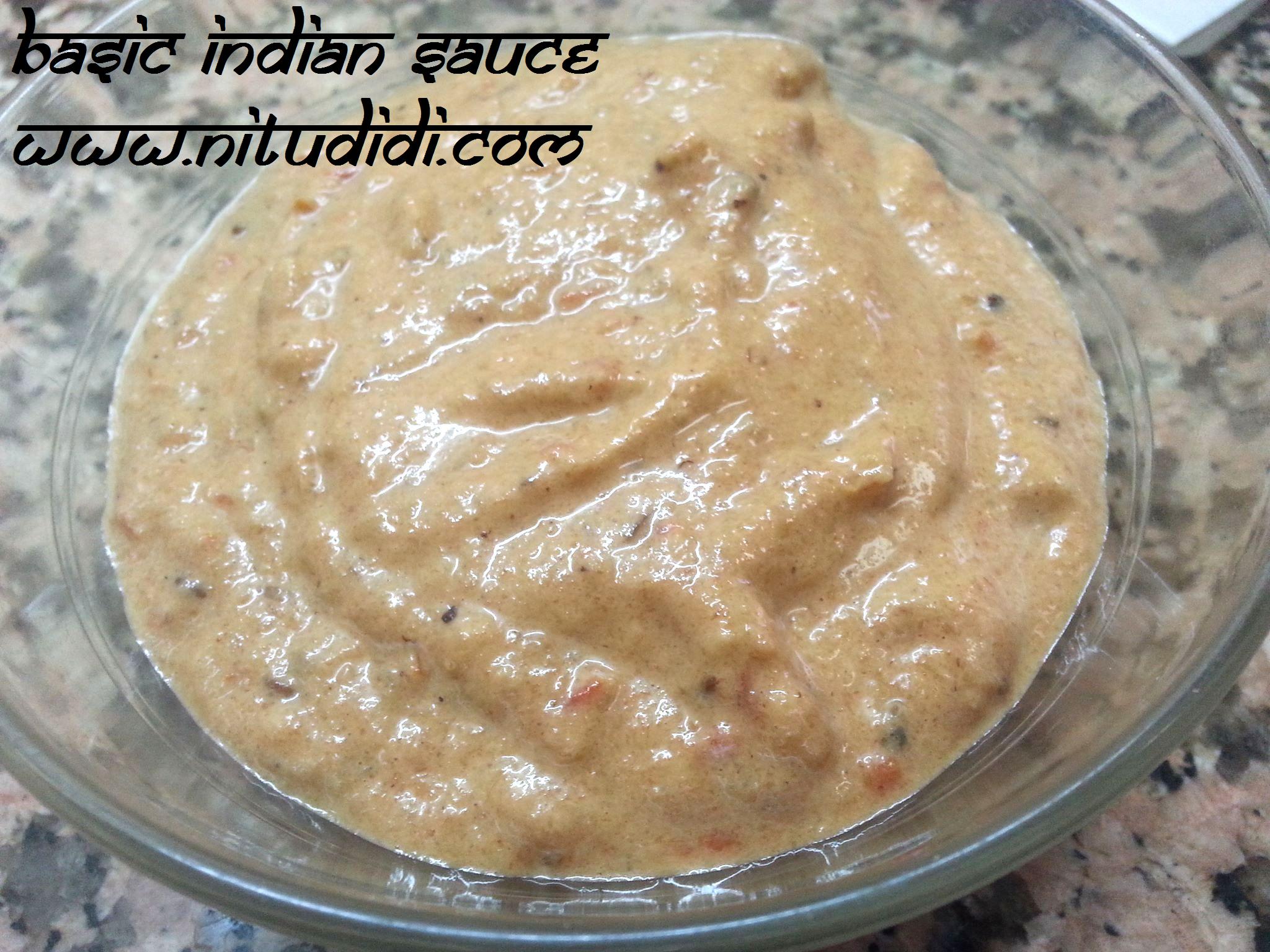 Having a basic sauce in the fridge/freezer is a real boon for days when you have no time to cook. I have been asked many a time for an easy , healthy , and yet delicious basic sauce for our desi cooking. This sauce is very versatile because you can enrich it in many ways. I will give you all the options. I made it a healthy way, using olive oil and NO ADDED coloring. Ofcourse this does not look like “restaurant food” but believe me, it tastes very good and just knowing that you are not adding anything artificial to it makes it all the more healthy and good for you. This keeps for a few days in the fridge and freezes wonderfully.